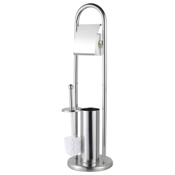 This toilet paper holder and floor cleaning brush is made of rust-resistant stainless steel. It features a stable, non-slip base, a protective top cover for the toilet paper, and a sealed brush holder to prevent water and odors from entering. Suitable for floor use without assembly, it measures 80 cm in height and has a 20 cm base diameter.