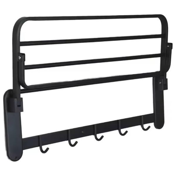 It offers a practical space-saving solution for small bathrooms. Made of durable metal with a rust-resistant matte black finish, it features a top shelf for folded towels or toiletries, a towel bar, and five hooks for loofahs and accessories.