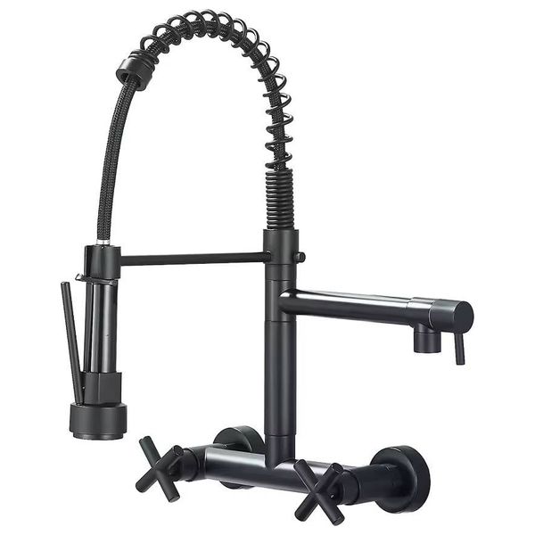 Wall-mounted mixer with two handles for water control, a flexible spring-loaded hose, and a retractable spray head for multitasking. Made of stainless steel/brass with a matte black finish for durability and a modern look.