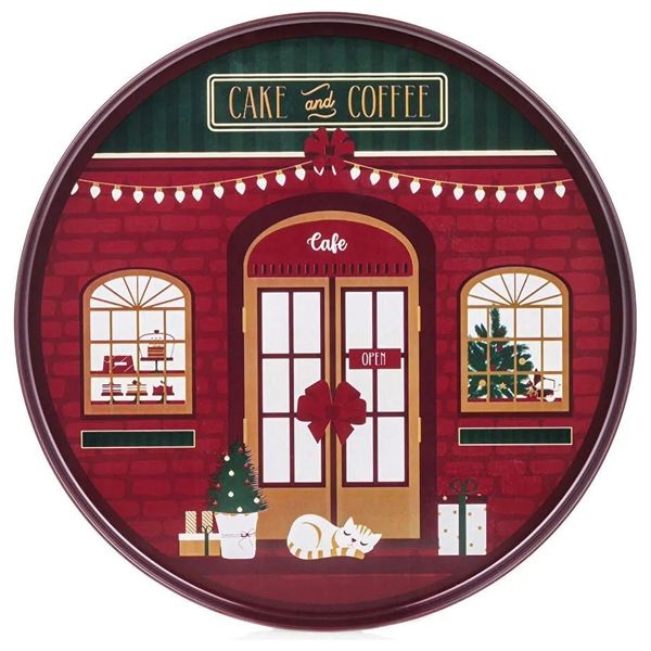 A 24cm round metal Christmas tray in bright red. A decorative tray with a Christmas design that captures the festive spirit.