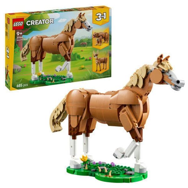 The horse is highly mobile, with its head, neck, hips, knees, and tail all movable, and rests on a grassy base. Using the same pieces, children can build three models: a moving horse, a bear with a small waterfall, or a moving deer. The set includes three models in one box, but they cannot be built simultaneously. The LEGO Builder app provides children with a creative adventure during construction, allowing them to save their progress and explore the 3D models.