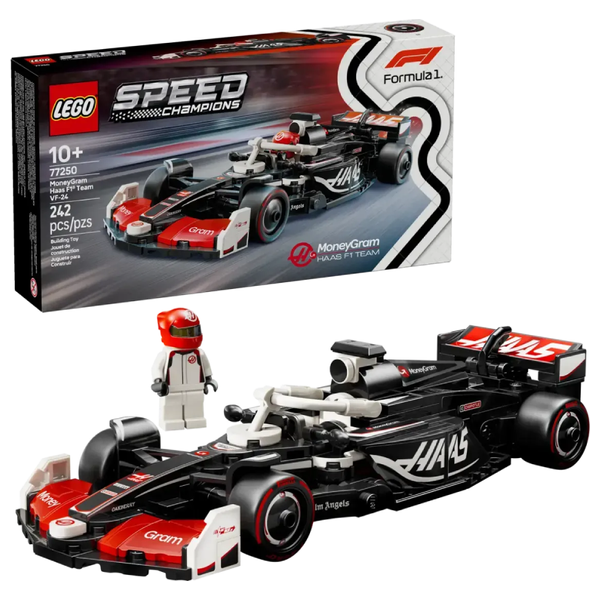 Relive the thrill of Formula 1 with the LEGO Speed Champions MoneyGram Haas F1 Team VF-24 Race Car set (77250). This 263-piece building toy recreates the Haas VF-24 from the 2024 season with authentic team logos, a rear wing, and functional suspension. The cockpit opens by lifting the roll hoop, and the set includes a minifigure in racing gear with a helmet. The model measures over 20 cm long, making it perfect for both play and display for fans in Iraq.