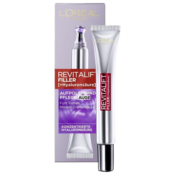Revitalift Filler Eye Cream by L'Oreal Paris is formulated with a high concentration of Hyaluronic Acid, specifically designed to target the delicate eye area. It effectively fills in wrinkles, replumps the under-eye hollows, and reduces the appearance of eye bags. The unique cooling precision applicator allows for easy, soothing application, helping to smooth and firm the eye contour for a more youthful, refreshed look. Suitable for all skin types, this cream provides intense hydration and helps restore lost volume.