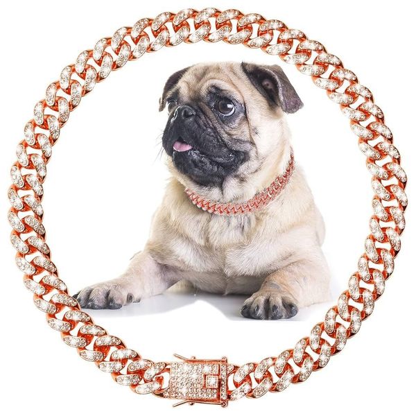 Luxury dog collar with a durable metal chain embellished with crystals, with a secure clasp, provides comfort and stability for small and medium dogs