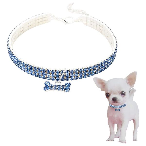 An elegant collar adorned with a white belt and blue crystals with a bone-shaped charm adds a sparkly and playful touch.