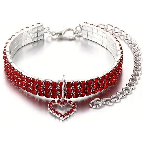 An elegant collar adorned with a silver metal band embroidered with crystals and a dangling heart pendant, adding a sparkling and luxurious touch to your pet's appearance.