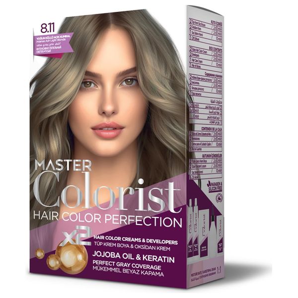 Master Colorest hair dye gives you a rich, vibrant, and long-lasting color. Its formula, enriched with jojoba oil and keratin, protects, nourishes, repairs, and strengthens hair during coloring. It also provides complete gray coverage. Paraben and silicone-free formula. The kit contains: two tubes of hair dye cream, one tube of oxidizing emulsion, one container of oxidizing emulsion, one container of hair care cream, and one pair of gloves.