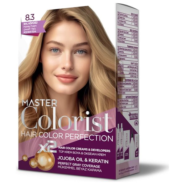 Master Colorest hair dye gives you a rich, vibrant, and long-lasting color. Its formula, enriched with jojoba oil and keratin, protects, nourishes, repairs, and strengthens hair during coloring. It also provides complete gray coverage. Paraben and silicone-free formula. The kit contains: two tubes of hair dye cream, one tube of oxidizing emulsion, one container of oxidizing emulsion, one container of hair care cream, and one pair of gloves.