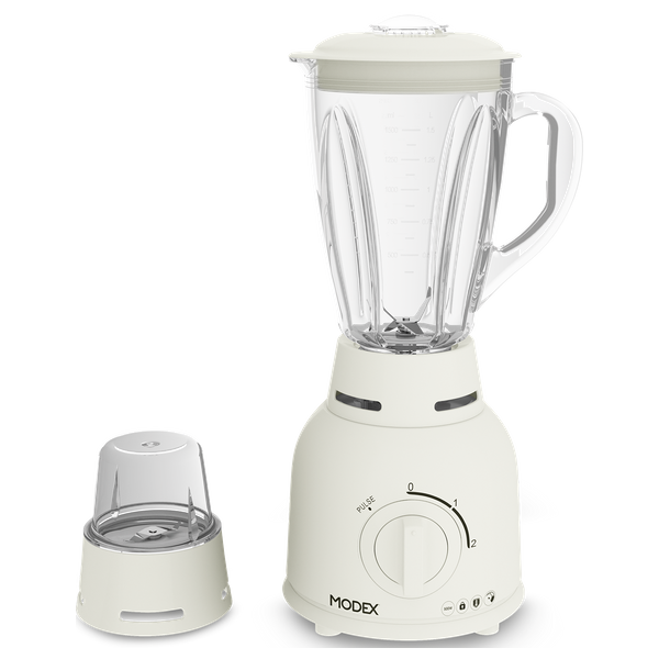 Modex 500W Blender with a 1.5L jar and a dedicated chopper attachment offers versatile blending for smoothies, sauces, and purees. The cream-colored body pairs with any kitchen, and the 3-speed settings plus pulse function give precise control for everyday cooking in Iraqi homes.