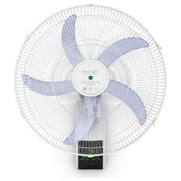 White wall-mounted fan with 3 speed settings, controllable via remote. Features strong steel blades and consumes 70W. Easy to adjust the angle to direct airflow as needed, perfect for home or office cooling.