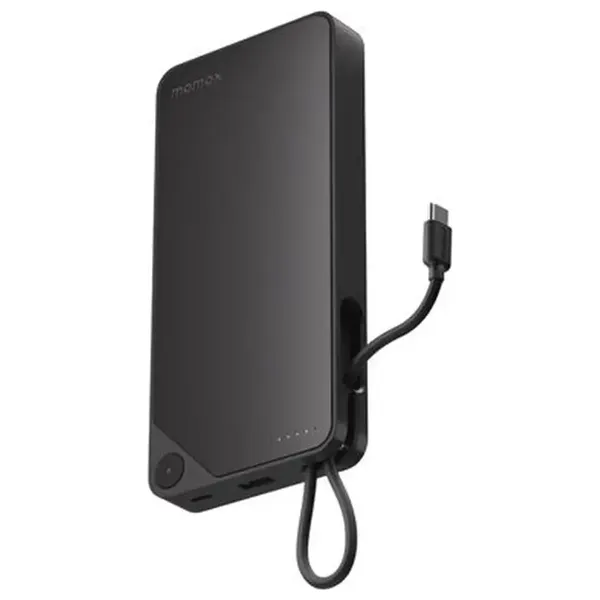 Portable 10,000mAh power bank with built-in USB-C cable for easy charging on the go, featuring compact design and integrated safety protections.