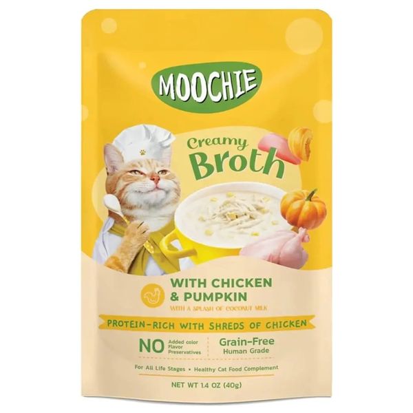 High-protein cat food featuring chicken strips in a creamy gravy with butternut squash. The formula is grain-free and contains no artificial colors, flavors, or preservatives.