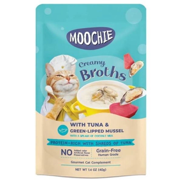 Mochi in a creamy broth containing tuna and green shells, provides a protein-rich nutritional supplement for cats, is free of artificial colors and is designed as a luxury addition to the cat's diet.