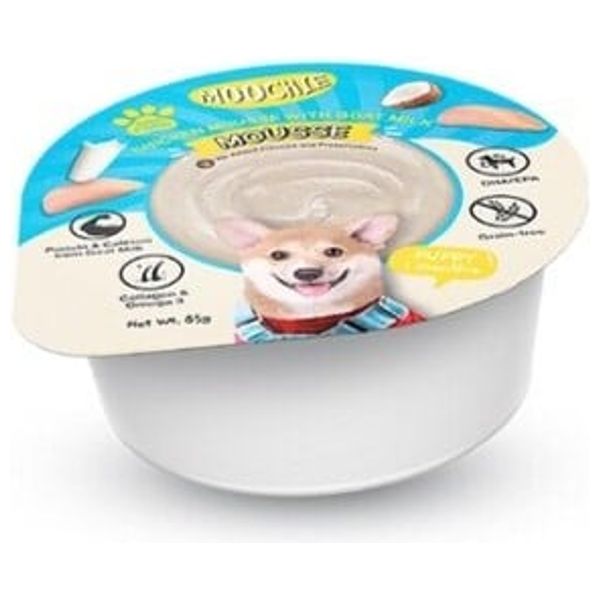 Ready-to-use wet meal for dogs, providing a smooth texture and chicken flavor with added goat's milk for increased taste and nutritional value.