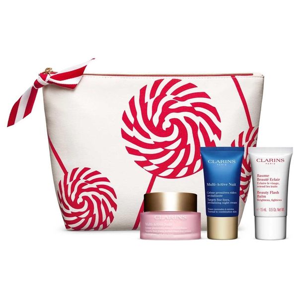 This set consists of a multi action day cream for all skin types 50 ml, a multi action night cream for normal to combination skin 15 ml, and a beauty flash balm 15 ml with a pouch.