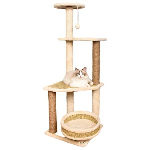 The Multi-Tier Cat Tower is a multi-level play space in a compact design for cats. It features multiple lounging platforms, a comfortable base bed, and a hanging ball toy to promote interaction and fun. The sturdy structure supports scratching and climbing.