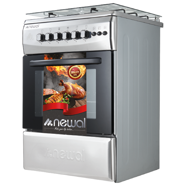 The Newal 4 Burner Free Standing Cooker combines practical design with durable construction. It features a stainless steel exterior, a glass door, and an enamel interior for easy cleaning and long-lasting use. Four gas burners with manual ignition, a protective top lid, and a heat- and impact-resistant glass lid enhance safety and convenience in the kitchen. The unit includes a protective cover and secure gas valve controls for reliable operation, making it suitable for family kitchens in Iraq.