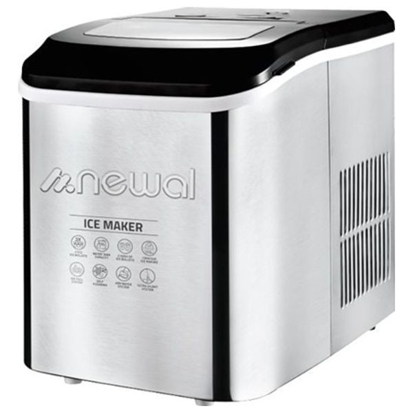 Newal ICE-2012 is a compact countertop ice maker designed for home use or light commercial settings. It features a 1.5-liter water tank and can produce about 9 ice cubes every 6–8 minutes. The unit offers two ice cube sizes, infrared sensor operation, a self-cleaning function, and an upgraded compressor and cooling system for better efficiency. A transparent lid allows monitoring of the ice formation, while a smart control panel ensures easy operation. A removable basket with scoop is included for serving, and the appliance runs at 105 W with a silver finish. Manufacturer warranty is one year.