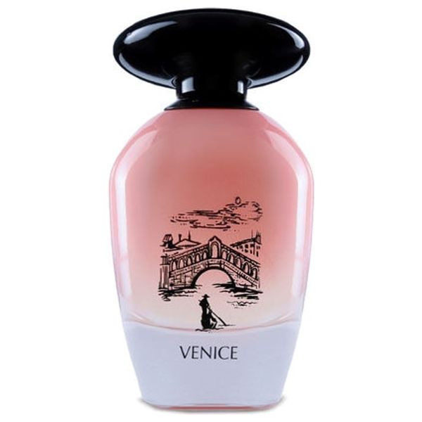 Night De Paris Venice is a 100 ml women's Eau de Parfum by L'orientale Fragrances. It opens with peach, green notes, and black currant; the heart blends rose, Turkish rose, and iris; the base combines white musk, cedar wood, pepper, and violet leaf. The bottle features a pink gradient with a black cap, reflecting a Venice-inspired aesthetic.