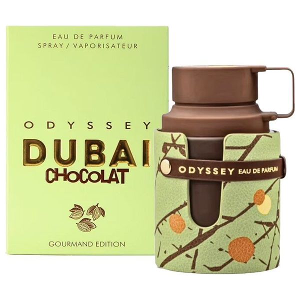 Odyssey Dubai Chocolat Gourmand is a men's Eau de Parfum by Armaf. It opens with Coffee, Pistachio, Praline, Hazelnut, and Knafeh, followed by Vanilla, Cardamom, and Chocolate at the heart, and a warm base of Caramel, Tonka Bean, and Amberwood. Packaged in the Gourmand Edition, this 100 ml bottle offers a rich, dessert-inspired gourmand profile with lasting warmth, suitable for evening wear and cooler seasons.