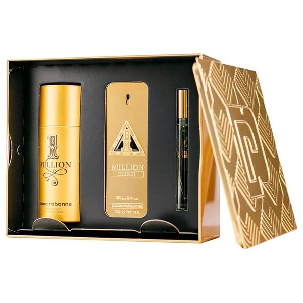 A gift set for men, including one million elixir intense perfume, 100 ml, deodorant spray 150 ml, and one million elixir intense mini perfume 10 ml.
