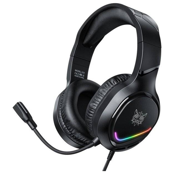 The Onikuma X31 RGB wired gaming headset features vibrant RGB lighting to enhance the gaming atmosphere, delivering immersive stereo sound through 50mm drivers. It comes with a 360-degree omnidirectional microphone with active noise cancellation, independent sound controls, and a comfortable adjustable headband with breathable ear cushions for long gaming sessions.