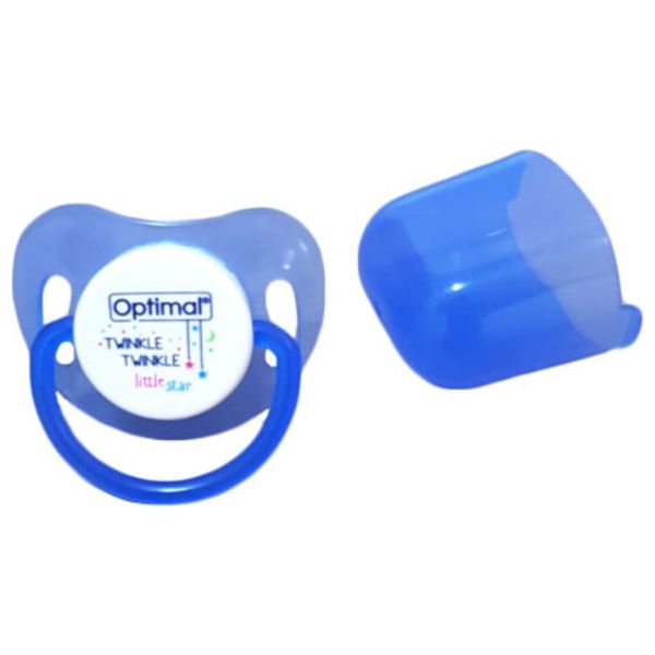 The Optimal blue silicone pacifier offers a soft silicone nipple to soothe a baby 6+ months during naps and strolls. Its rounded head design provides gentle comfort and reliable everyday use.
