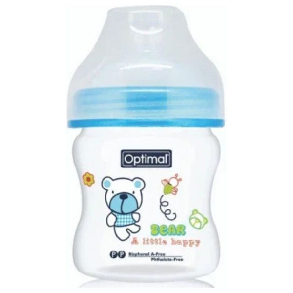 The Optimal P.P Extra Wide Neck Feeding Bottle 150ml offers a comfortable feeding experience for babies aged 0–6 months. Its extra-wide neck and shape closely resembling breastfeeding help with latch and feeding comfort. The orthodontic anti-colic nipple reduces air intake and gas. The bottle has a capacity of 150 ml (5 oz) and weighs about 0.1 kg, providing a lightweight, easy-to-use feeding solution.