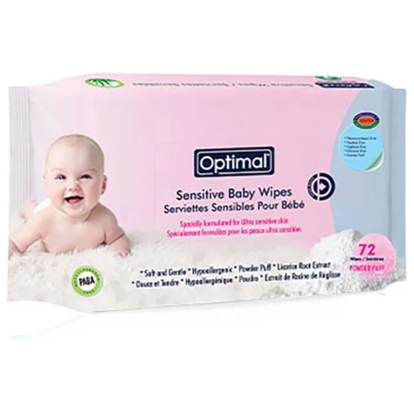 Optimal Sensitive Baby Wipes are gentle wet wipes designed for a baby's delicate skin. This 72-wipe pack is formulated to be free from parabens, sulfates, chlorine and phenoxyethanol, with aloe vera extract to help soothe irritation. It also contains baby powder for a soft feel and is suitable for sensitive skin.