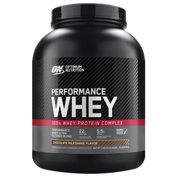 Optimum Nutrition Performance Whey is a whey protein blend designed to support muscle recovery and growth for goal-driven individuals. It delivers 22 g of protein per serving and 5.5 g of naturally occurring BCAAs per serving, with a gluten-free formula. The product is easy to mix using a glass and spoon and comes in Chocolate Milkshake flavor in a 1.95 kg container. It is tested for banned substances to ensure quality.