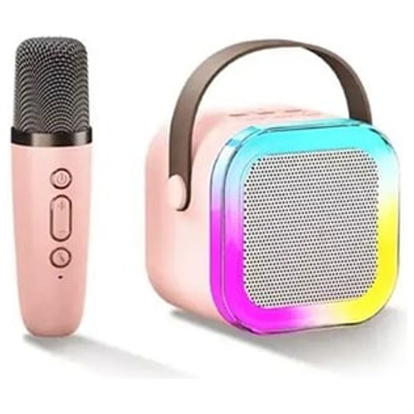 Portable K12 wireless Bluetooth karaoke machine with a microphone. This compact system delivers clear stereo sound with dynamic RGB LED lighting for lively karaoke sessions. It supports USB, TF cards, and AUX input, and includes a built-in microphone. With an approximate 2000 mAh battery, it offers hours of entertainment for home gatherings and outdoor parties.