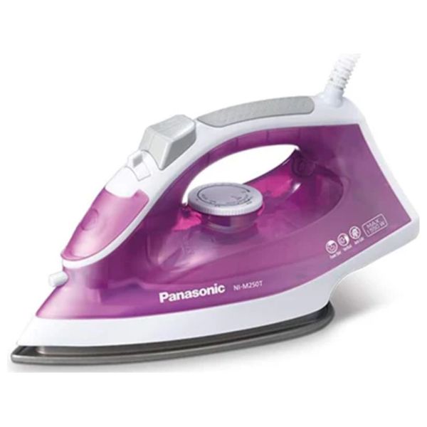 Panasonic NI-M250TPTQ is a compact steam iron with 1550 W heating, a titanium-coated soleplate for smooth gliding, vertical steam burst for hanging garments, and continuous steam from 0 to 15 g/min. It features anti-scale protection, lightweight design, a 360° swivel cord, and a push-button spray mist. Color: Purple.