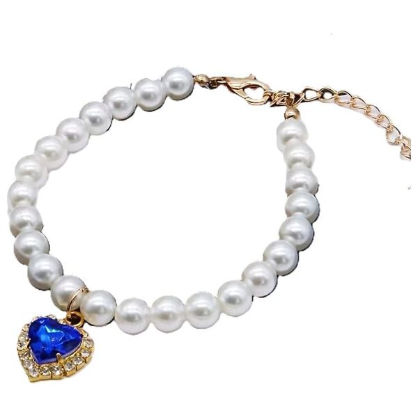 A gold-tone chain adorned with white pearl beads and a blue heart pendant surrounded by sparkling stones. It features a secure lobster clasp and is adjustable in length.