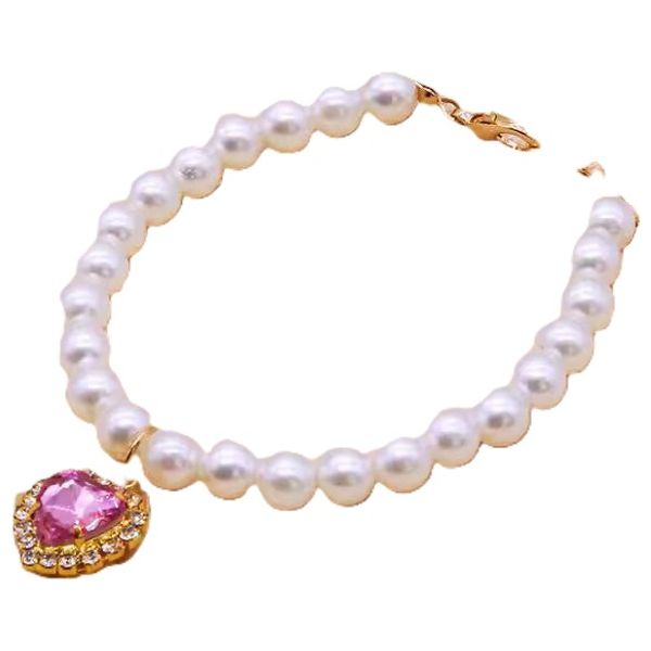 Gold chain adorned with white pearl beads and a pink heart pendant surrounded by clear stones