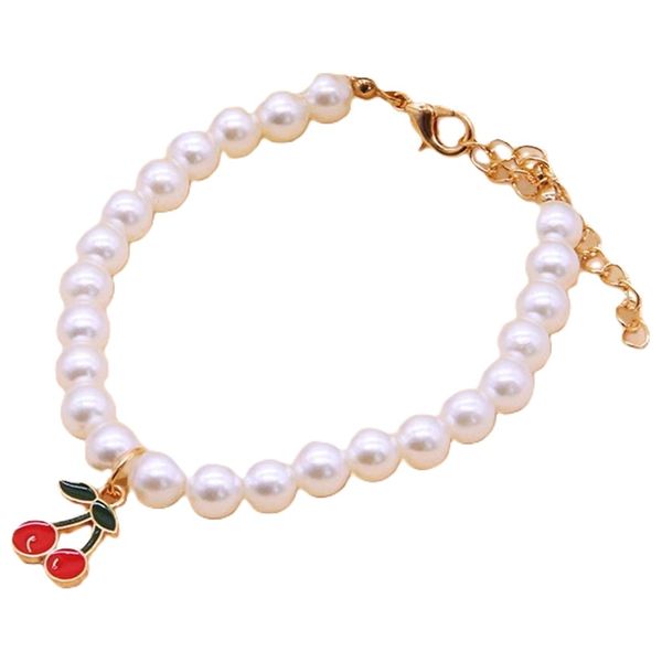 Elegant white pearl bead bracelet with a small cherry pendant, set with a gold metal frame and adjustable extension chain for perfect comfort.