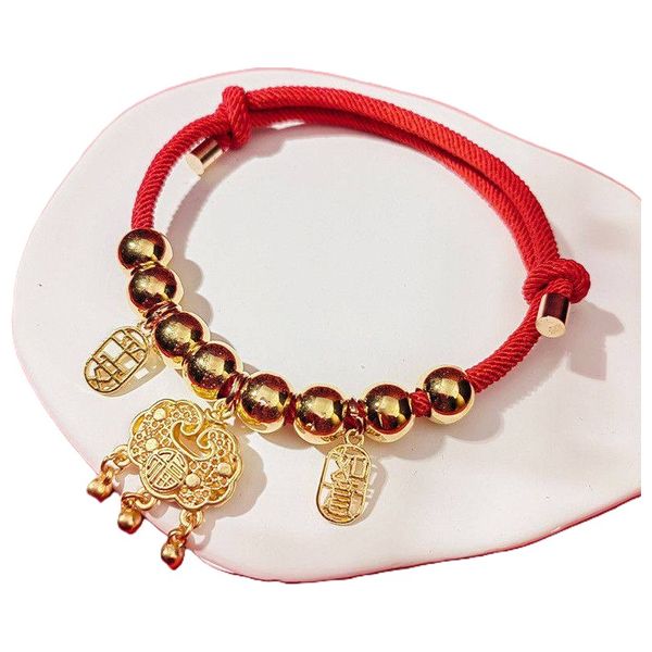 Elegant design, necklace decorated with faux pearls on an adjustable red string, decorative details with small gold pendants and dangling charms for a distinctive look, practical comfort, lightweight, comfortable and easy to clean