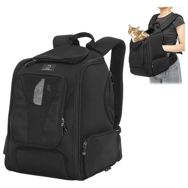 Fits cats and small dogs up to 18 lbs. Made of durable Oxford fabric with anti-scratch mesh. Provides excellent ventilation via a top window and two side windows. Includes a comfortable hip belt, padded shoulder straps, and a removable soft base. Comes with three large mesh windows, two side pockets, and a built-in safety leash to ensure your pet's comfort and safety during travel and outdoor trips.