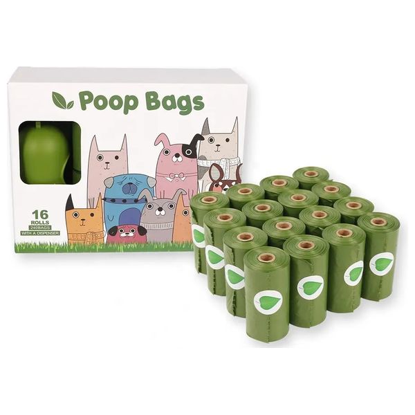 Biodegradable pet waste bags, 16 rolls with dispenser for quick and tidy cleanup during daily walks and pet care. The bags are designed to be durable and easy to tear to provide a convenient solution for responsible waste management.
