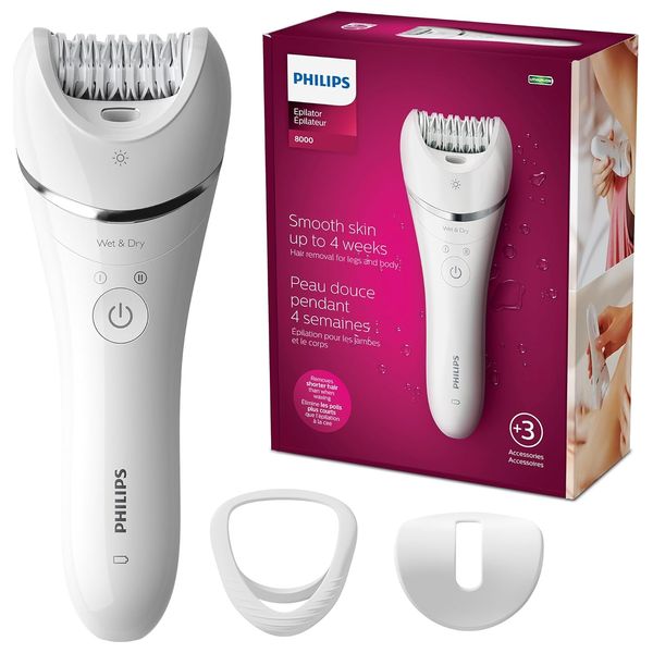 The Philips 8000 epilator provides efficient wet & dry hair removal. A built-in light helps reveal any remaining hairs while ceramic discs with a micro-ridged surface firmly capture hairs as short as 0.5 mm. Includes a delicate area cap, an optimal contact cap, and a drawstring pouch for convenient storage. Cordless use up to 40 minutes with a 60-minute charge. Suitable for use on wet or dry skin.