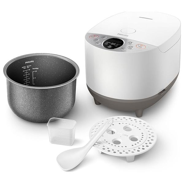 Philips rice cooker with a 1.5 liter capacity rice cooking for daily meals. The package includes a non-stick inner pot, a steaming tray, a measuring cup, and a rice paddle for convenient preparation and serving. It features a voice search option and a simple control panel for consistent results in modern kitchens, including Iraqi households.