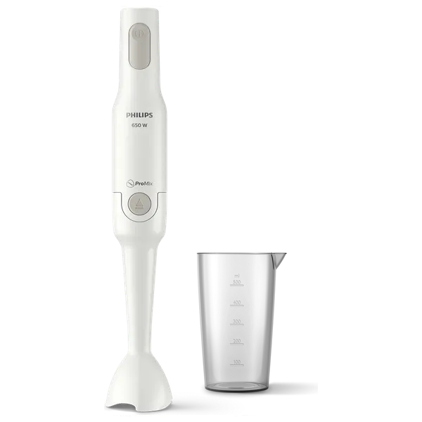 Philips HR2531/01 Hand Blender delivers reliable blending for soups, sauces, and smoothies. Powered by a 650 W motor and a simple one-speed control, it provides consistent results in seconds. The white finish fits any kitchen, and its compact design makes everyday blending easy.