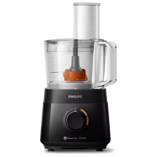Philips PowerChop food processor with a 1.5 L bowl and a powerful 750W motor for efficient chopping and blending. It features two speed settings and includes six attachments to handle a wide range of recipes. The compact black unit provides clear visibility through the transparent bowl and is designed for easy cleaning and reliable kitchen performance.