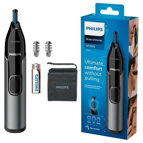 The Philips NT3650 Ear & Nose Trimmer delivers a precise trim for unwanted hair around the ears and nose. It is powered by an AA battery and is fully washable for easy cleaning. The kit includes two eyebrow combs and a pouch, making it convenient for home use and travel. No oil is needed for operation, and its compact design ensures comfortable handling.