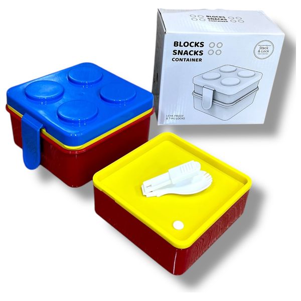 حافظة طعام بلاستيكية شكل ميكانو مربع مع ملعقة بلاستيكية