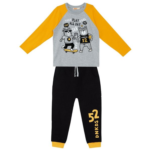 2 piece set. Long, reglan sleeve, round neck, cotton jersey t-shirt. Has cute animals print on. The set has a Harem style pants made of black French Terry cotton. Has a print on single leg. Has 2 side pockets. Elasticated waist and strings. All Denokids products are produced within kids safety guidelines and dedected by needle dedectors., Material Top: Fabric1:67% Polyester 27% Cotton 6% Elastane Fabric2: 94% Cotton 6% Elastane - Bottom: 100% Cotton, Washing ins. Machine wash at 30°C. Wash inside out. Do not bleach. Do not tumble dry. Iron backside on low heat.