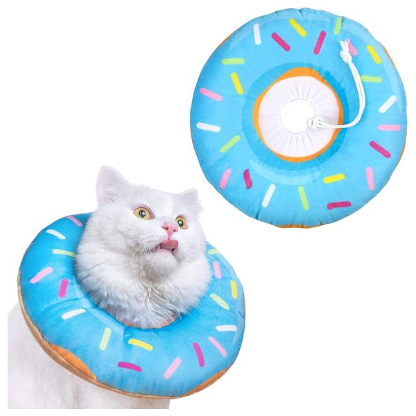 Soft, cotton-filled collar prevents licking or biting of wounds after injuries or surgery. Comfortable design allows for normal eating, drinking, and sleeping. Adjustable size to fit cats and small dogs.