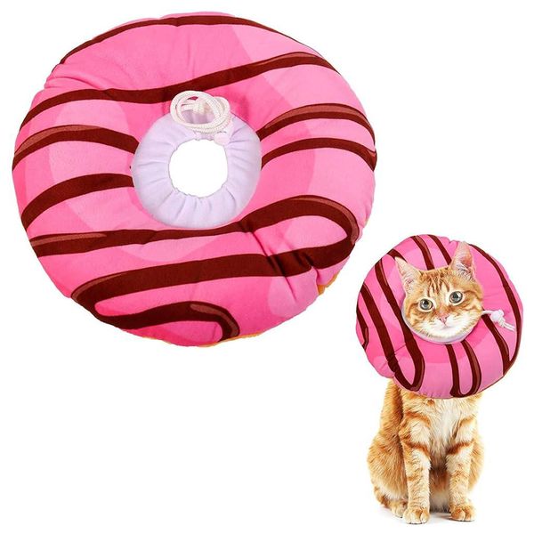 Soft, cotton-filled collar prevents licking or biting of wounds after injuries or surgery. Comfortable design allows for normal eating, drinking, and sleeping. Adjustable size to fit cats and small dogs.