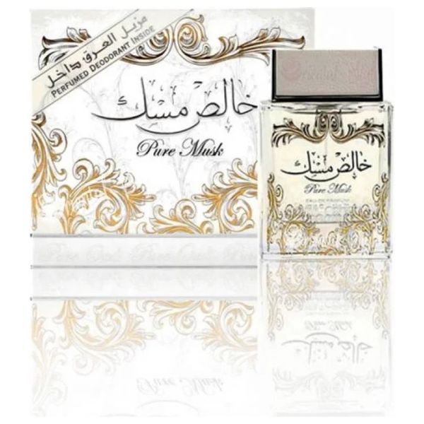 Lattafa Pure Musk is a unisex Eau de Parfum (100 ml) featuring a warm, woody profile. Cedar and oud open the scent, followed by lavender, rosemary and sage in the heart, with patchouli and vetiver grounding the base. The result is a versatile fragrance suitable for daily wear and evening occasions, presented in a greenish gray bottle that reflects its sophisticated character.
