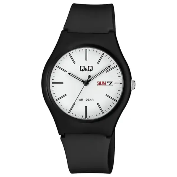 Men's watch with a white resin case, 38mm diameter and 11mm thickness, quartz movement, white dial, black resin strap with safety clasp, 10 bar water resistance, analog display