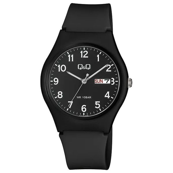 A stylish and practical men's watch with a round black dial and a durable black resin strap, featuring an analog display and scratch-resistant acrylic glass. It has a 38mm case size, is 11mm thick, weighs a light 30 grams, and has a secure buckle clasp. Water resistant up to 10 bar.